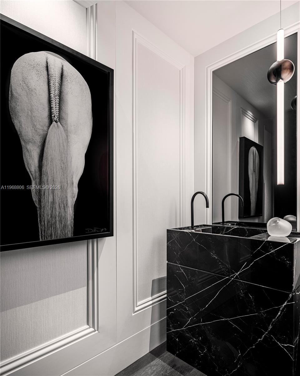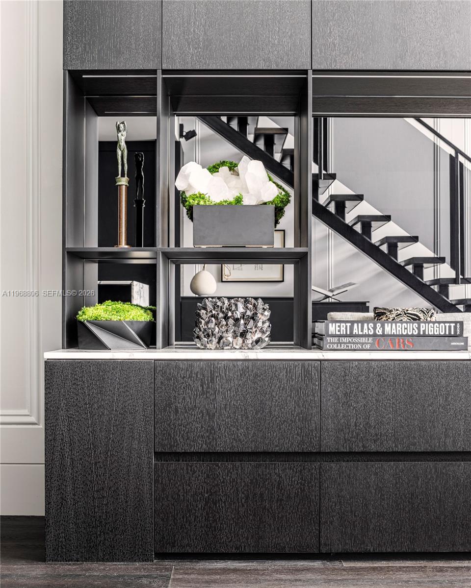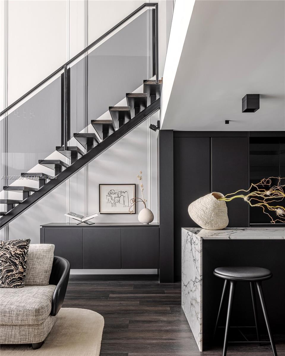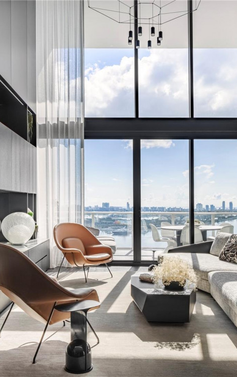 Чистые шкафы, яркая лестница из дымчатого стекла и стали, а также нестандартные вертикальные столярные изделия создают скульптурные фокусы, редко встречающиеся в сопоставимых жилых домах. Из просторной экспозиции, выходящей на восток, открывается вид на Музейный парк, залив Бискейн и сверкающие горизонты Майами и Саут-Бич.