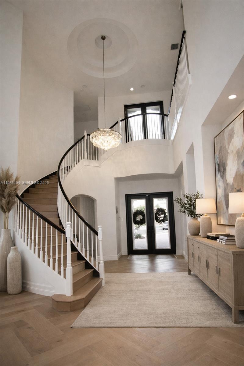 Эффектный двухэтажный вход с двойными стеклянными дверями и широкой лестницей создает великолепное первое впечатление. В доме красивые деревянные полы, высокие потолки и большие окна, которые наполняют пространство естественным светом. Новая отделка окон и изготовленные на заказ электрические жалюзи добавляют стиля и удобства.