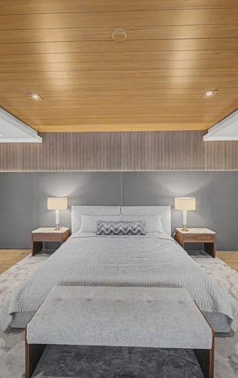 Трехуровневая резиденция отличается изысканной итальянской отделкой, стеклянными стенами и плавным соединением внутреннего и наружного пространства. Дом включает в себя семь спален, оздоровительный центр и тренажерный зал, кабинет руководителя и основной люкс, из которого открывается потрясающий вид на воду, с просторными ванными комнатами для него и для нее, ориентированными на набережную.