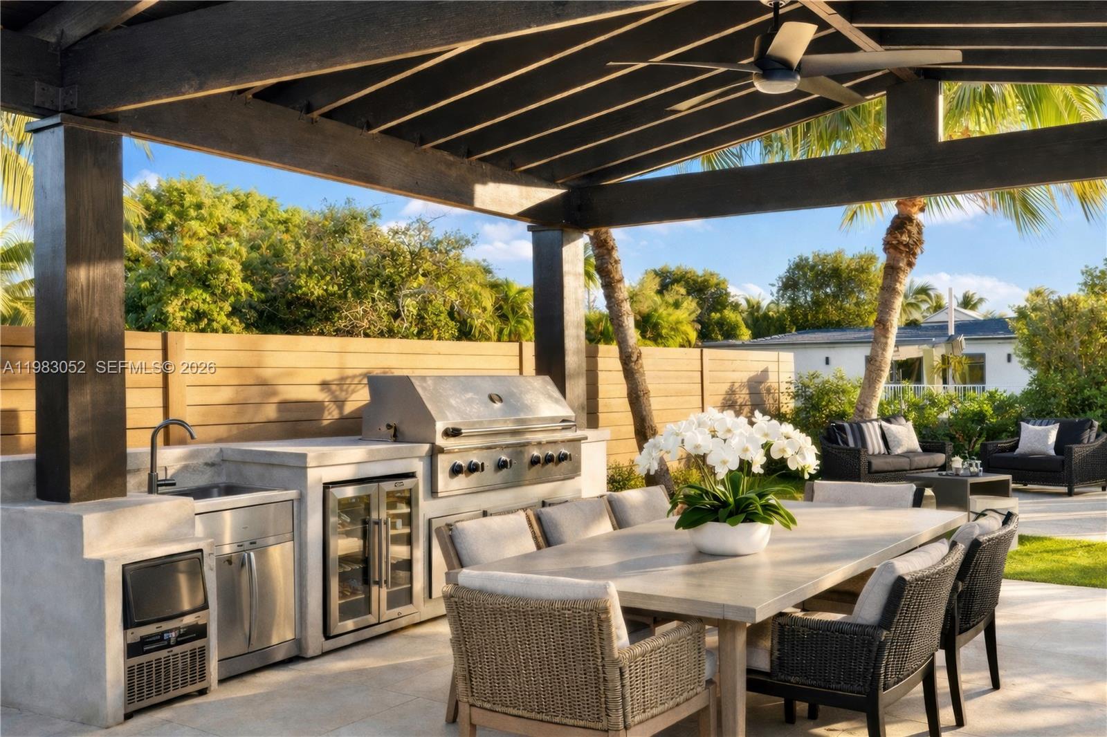 Открытая планировка плавно переходит на участок площадью 9000 SF с бассейном курортного типа и полностью оборудованной летней кухней, созданной для круглогодичного проживания под небом Майами. Кладовая, отдельная прачечная и просторная парковка не оставляют желать лучшего.